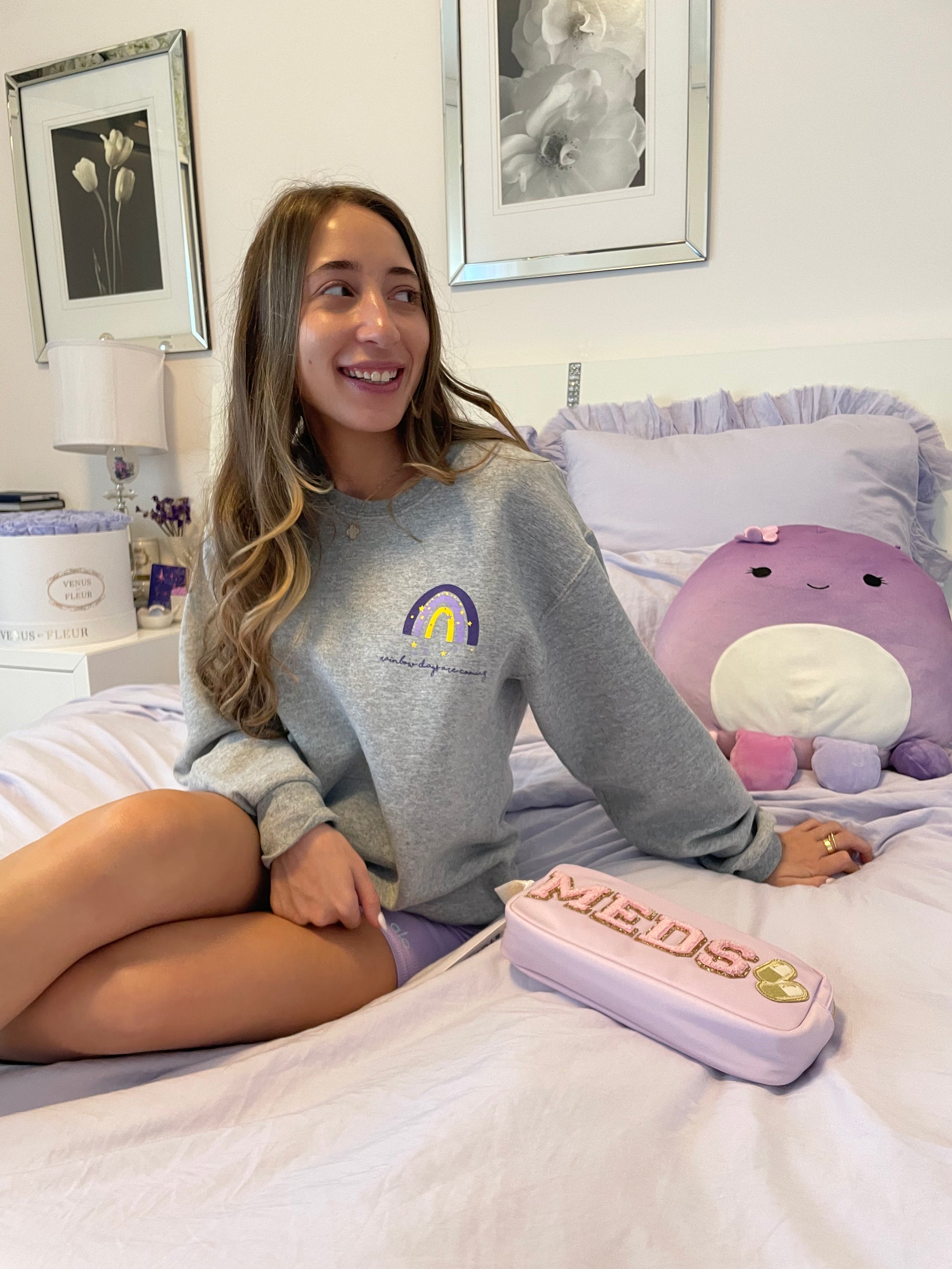 Super soft oversized crewneck. Has 'Rainbow days are coming.' on front, and 'Invisibly sick lala' on the back. Warm & Cozy. Hip length, long sleeve.